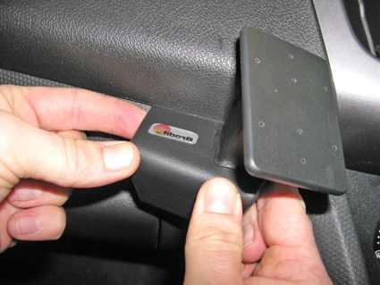 Use the enclosed alcohol pad to clean the area where the ProClip is to be installed. Peel off the adhesive tape covers on the ProClip. Press the right corner of the angled upper edge of the ProClip into the gap dividing the dashboard.