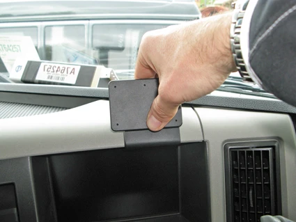 Use the enclosed alcohol pad to clean the area where the ProClip is to be installed. Remove the adhesive tape covers on the ProClip. Press the curved upper edge of the ProClip into the gap on top of the dashboard. Press the ProClip downward so the curved edge goes all into the gap.