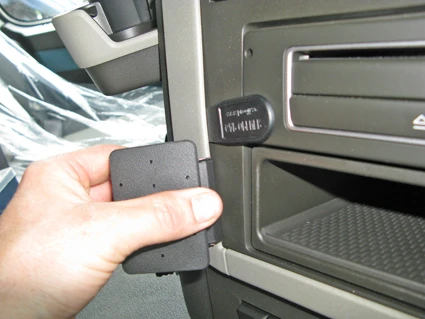 Use the enclosed alcohol pad to clean the area where the ProClip is to be installed. Remove the adhesive tape covers on the ProClip. Press the thin end of the enclosed gap opener into the gap between the center control panel and the surrounding frame, to widen the gap.