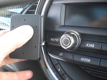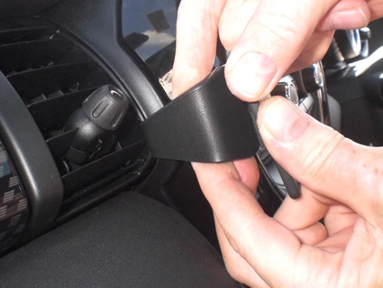 Use the enclosed alcohol pad to clean the area where the ProClip is to be installed. Peel of the adhesive tape cover on the ProClip. Place the angled right edge of the ProClip over the ring surrounding the center instrument panel.