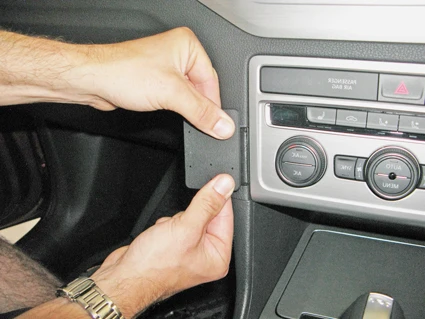 Use the enclosed alcohol pad to clean the area where the ProClip is to be installed. Remove the adhesive tape covers on the ProClip. Press the angled left edge of the ProClip into the gap on the center console side wall.