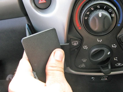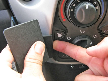 Use the enclosed alcohol pad to clean the area where the ProClip is to be installed. Peel of the adhesive tape cover on the ProClip. Place the angled right edge of the ProClip by the edge of the frame surrounding the center console control panel.