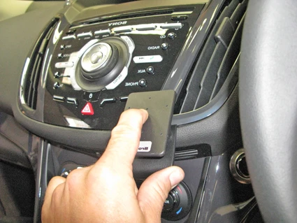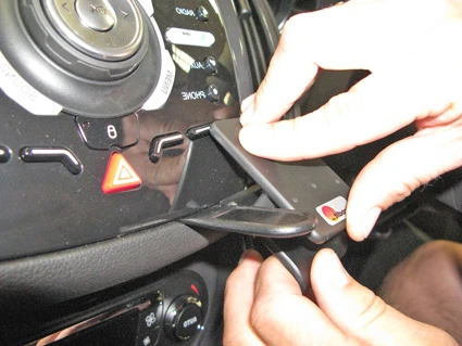 Press the thin end of the enclosed gap opener into the gap between the center console panel frame and the padded part of the dashboard, to widen the gap. Press the angled edge on the upper part of the ProClip into the gap next to the gap opener. Pull out the gap opener. 2 Move the lower part of the ProClip downward so the angled upper edge goes all the way into the gap.