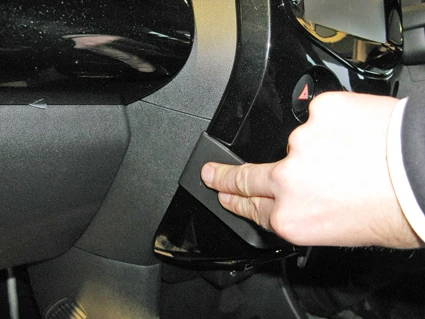 Use the enclosed alcohol pad to clean the area where the ProClip is to be installed. Insert the thin end of the enclosed gap opener by the edge of the frame surrounding the center console control panel, to widen the gap. Peel off the adhesive tape cover on the ProClip.