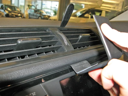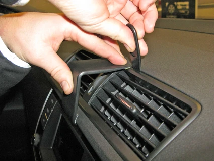 Use the enclosed alcohol pad to clean the area where the ProClip is to be installed. Press the thin end of the enclosed gap opener into the gap between the air vent frame and the dashboard, to widen the gap. Remove the adhesive tape covers on the ProClip.