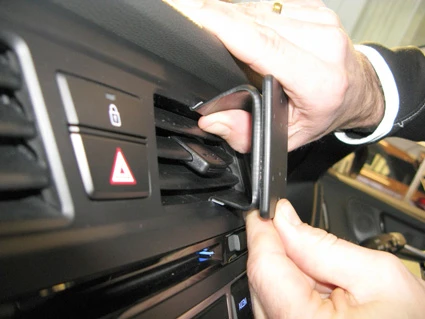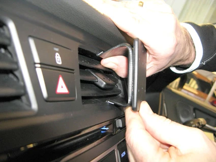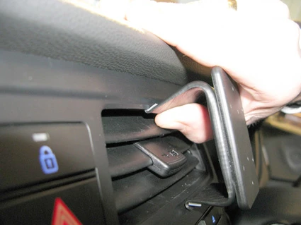 Press the lower part of the ProClip upward and forward. Hook the angled lower edge of the ProClip into the gap between the air vent and the surrounding frame.