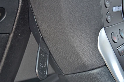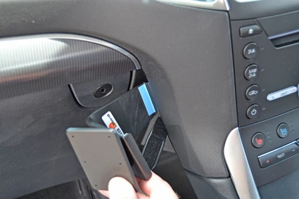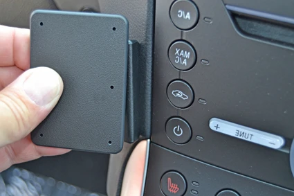 Pull the front part of the ProClip slightly toward you so the angled right edge hooks into the gap between the padded part of the console side wall and the climate control panel. The ProClip is in place.