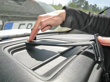 Press the thin end of the enclosed gap opener into the gap surrounding the storage compartment on top of the dash, to widen the gap. Use the enclosed alcohol pad to clean the area where the ProClip is to be installed. Remove the adhesive tape cover on the ProClip.
