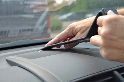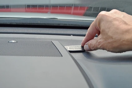 Use the enclosed alcohol pad to clean the area where the ProClip is to be installed. Press the thin end of the enclosed gap opener into the gap on the right side of the panel surrounding the upper center vents and the top of the dashboard, to widen the gap on the side and the front. Remove the adhesive tape cover on the ProClip.