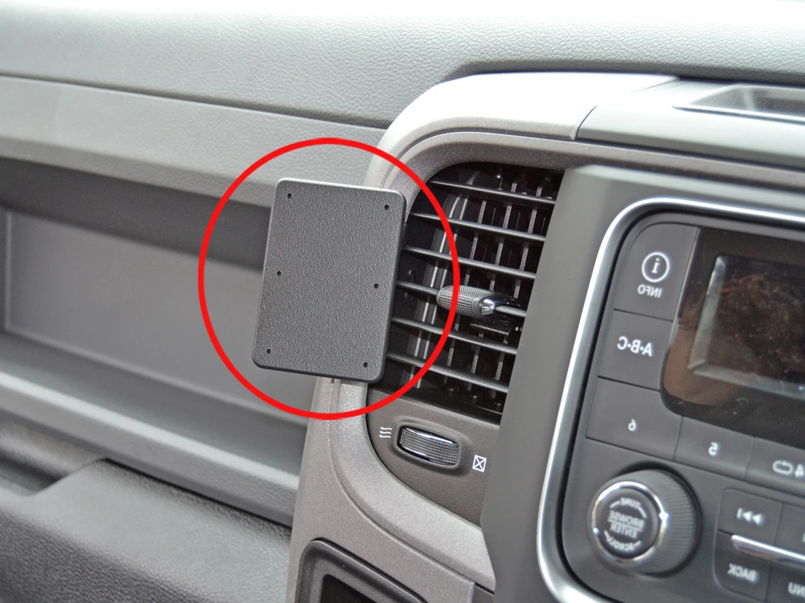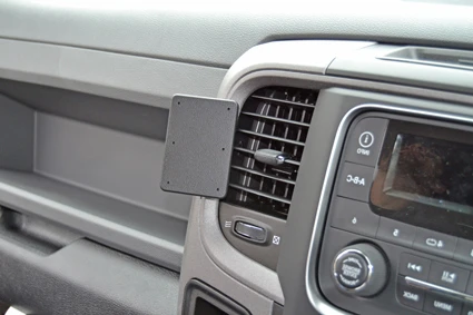 Move the ProClip rightward so the angled left edge hooks behind the storage cubby frame. Hook the angled right edge of the ProClip around the left edge of the air vent frame. Press the ProClip forward to make sure the adhesive tape attaches properly.