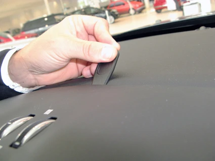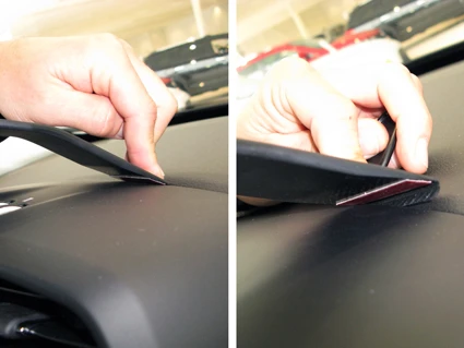 Use the enclosed alcohol pad to clean the area where the ProClip is to be installed. Press the thin end of the enclosed gap opener into the gap between the dashboard and the console around the air vent, to widen the gap. Peel off the adhesive tape covers on the ProClip.