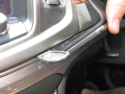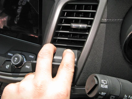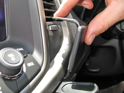 Move the ProClip upward/forward so the angled lower edge goes into the gap and hooks behind the panel. Remove the gap opener. Insert the upper angled edge into the gap on the lower inside of the air vent. Make sure the cut outs fit into the gap.