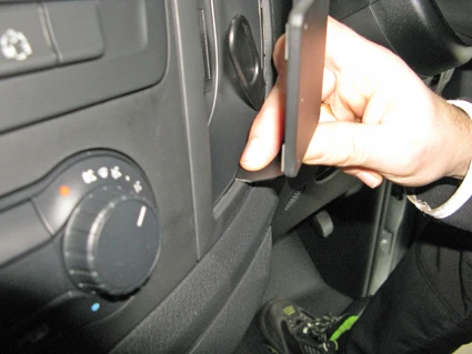 Insert the lower edge of the ProClip into the gap next to the gap opener, slide the ProClip leftward so it aligns with the left side of the storage compartment sidewall.