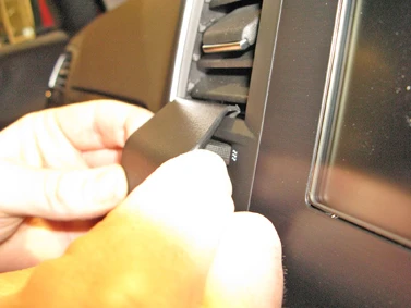 Move the upper edge of the ProClip upward/forward so the lower angled edge hooks behind the paneling. Hook the angled upper edge of the ProClip into the gap in the lower edge of the air vent.