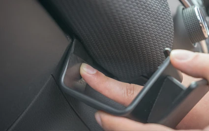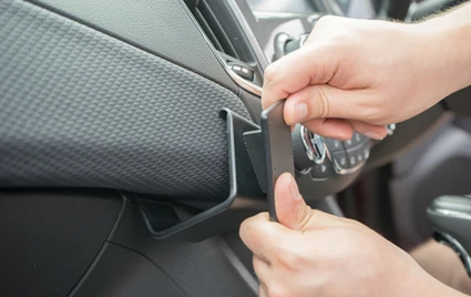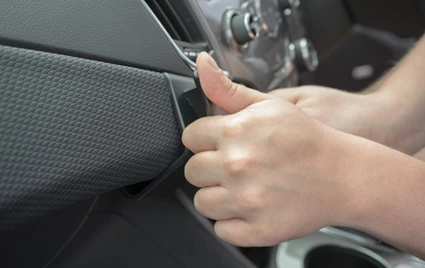Insert the lower angled edge of the ProClip into the seam between the dash panel to the left of the glove compartment door and the curved panel above.