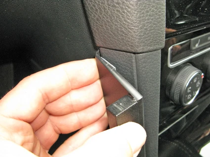 Use the enclosed alcohol pad to clean the area where the ProClip is to be installed. Remove the adhesive tape cover on the ProClip. Press the angled edge of Part 1 into the gap on the outer side of the center console.