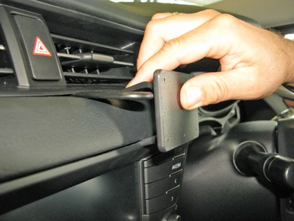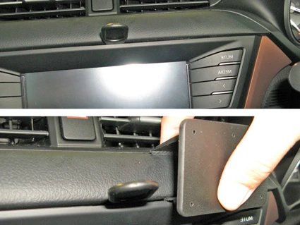 Insert one of the enclosed gap openers into the gap between the frame surrounding the information display and the remainder of the center console, to widen the gap. Insert the grooved lower edge of the ProClip into the gap next to the gap opener. Make sure it goes all the way in. Remvove the gap opener.