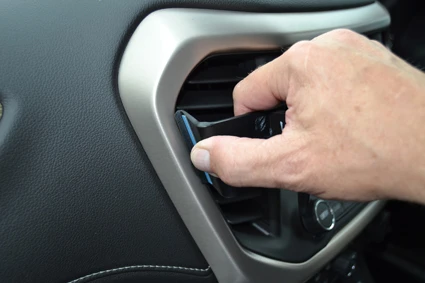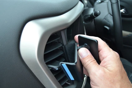 Adjust the height of the ProClip in order to match the left part with the shape of the silver frame. Flex the ProClip to the right and press the thin left angled edge into the gap behind the frame surrounding the air vent. If needed: Use the enclosed gap opener to widen the gap.