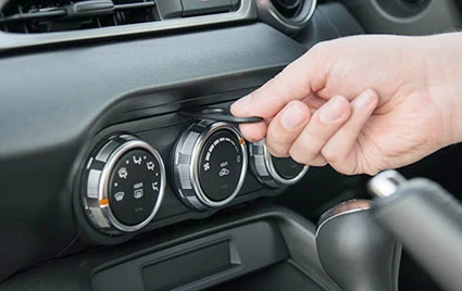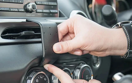 Use the enclosed alcohol pad to clean the area where the ProClip is to be installed. Press the thin end of the enclosed gap opener into the gap between the frame surrounding the climate control panel and the dashboard, to widen the gap. Remove the adhesive tape cover on the ProClip.