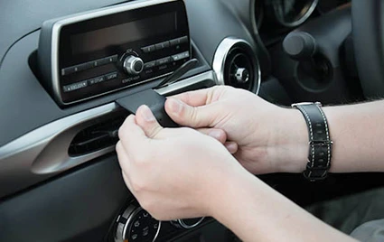 Press the gap opener into the gap between the panel surrounding the display and the frame surrounding the air vent. Pull the upper part of the ProClip upwards and hook the angled edge into the gap next to the gap opener. Press downwards on top of the ProClip so the angled edge goes all the way into the gap and the adhesive tape attaches properly. Pull out the gap opener.