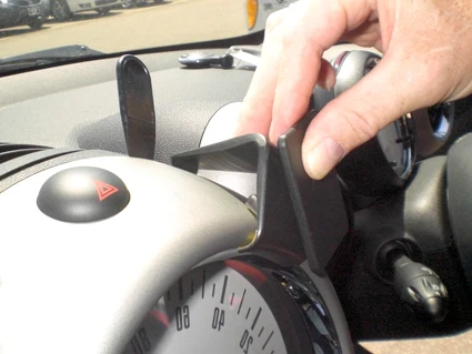 Press the thin end of the enclosed gap opener into the gap between the two dashboard sections, to widen the gap. Use the enclosed alcohol pad to clean the area where the ProClip is to be installed. Peel off the adhesive tape cover on the ProClip.