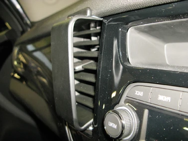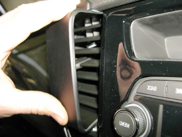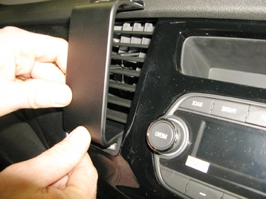 Press the upper part of the ProClip downward and forward, flexing it, and insert the angled upper edge into the gap between the dashboard overhang and the frame surrounding the air vent. Press forward on the ProClip so the angled edge goes all the way into the gap and the top part rests on the dashboard.