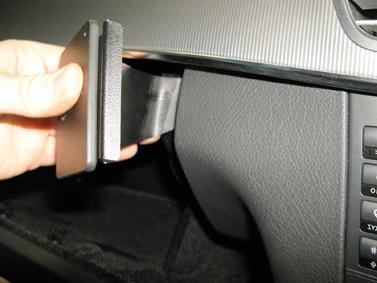 Open the glove compartment. Press the angled edge on the left part of the ProClip into the gap between the glove compartment and the dashboard.