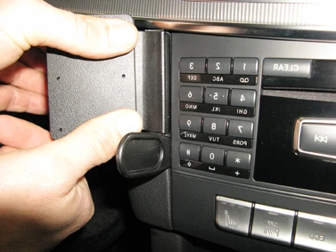 Press the thin end of the enclosed gap opener into the gap between the control panel and the center console frame, to widen the gap. Press the right edge of the ProClip into the gap above the gap opener. Press forward on the right part of the ProClip so the edge goes all the way into the gap. Pull out the gap opener.