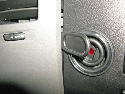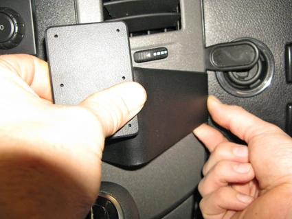 Press the curved edge on the left part of the ProClip into the gap between the frame surrounding the control panel and the frame surrounding the air vent. Flip the ProClip rightwards/forwards so the curved left edge hooks behind the frame surrounding the control panel.