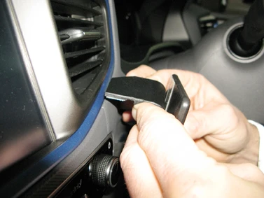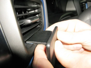 Hook the upper part of the ProClip over the air vent frame so the upper edge is placed in the lower part of the air vent. Press fownward on top of the ProClip so the adhesive tape attaches properly.
