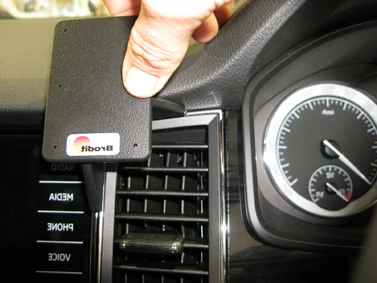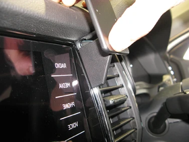 Press the grooved edge on the upper part of the ProClip into the gap between the frame surrounding the air vent and the dashboard overhang. Press forward on the upper part of the ProClip until you hear/feel it snaps into place in the gap.