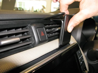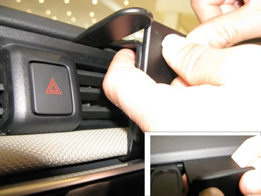 Press the thin end of the enclosed gap opener into the gap between the frame surrounding the air vent and the dashboard, to widen the gap. Press/Hook the angled edge on the lower part of the ProClip into the gap between the center console and the dashboard.