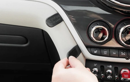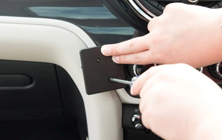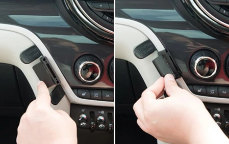 Press the angled edge on Part 1 into the gap between the gap openers. Rotate Part 1 to the left and press forward so the angled edge hooks behind the frame surrounding the control panel and the adhesive tape attaches to the dashboard. Pull out the gap openers.