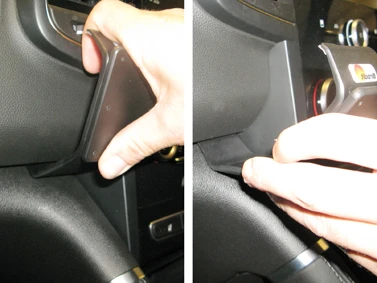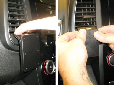 Use the enclosed alcohol pad to clean the area where the ProClip is to be installed. Peel off the adhesive tape cover on the ProClip. Place the ProClip right by the center console. Press the angled edge on the lower part of the ProClip into the gap between the dashboard by the glove compartment and the center section of the dashboard. Press/Flip the ProClip upward/forward so the angled lower edge hooks behind the dashboard by the glove compartment.