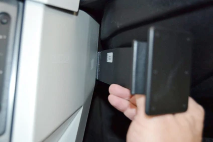 Use the enclosed alcohol pad to clean the area where the ProClip is to be installed. Peel off the adhesive tape cover. Hook the "J" shaped egde on the right part of the ProClip around the side panel of the center console.