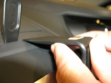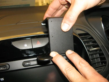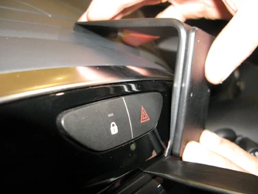 Use the enclosed alochol pad to clean the area where the ProClip is to be installed. Press the thin end of the enclosed gap opener into the gap between the frame surrounding the display and the dashboard, to widen the gap. Peel off the adhesive tape cover on the ProClip. Press the angeld edge on the lower part of the ProClip into the gap next to the gap opener.