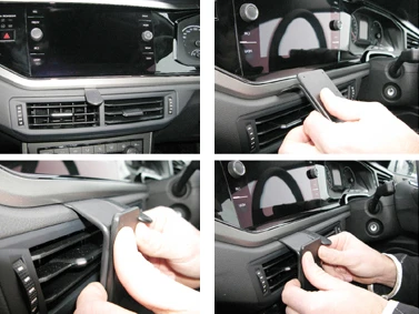 Press the thin end of one of the enclosed gap openers into the gap between the dashboard surrounding the air vent and the dashboard surrounding the display, to widen the gap. Press the S-shaped edge on the upper part of the ProClip into the gap next to the gap opener. Press the ProClip forward, then press it downward so the upper edge hooks behind the dashboard surrounding the display. Pull out the gap opener.