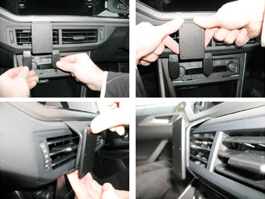 Press both gap openers into the gap between the frame surrounding the air vent and the dashboard. Press the lower part of the ProClip away from the dashboard and hook the angled lower edge into the gap between the gap openers. Press upward in the lower part of the ProClip so the angled edge goes all the way into the gap. Pull out the gap openers.