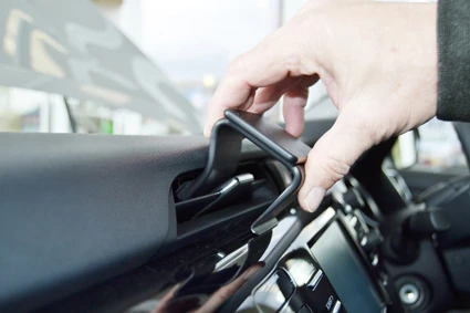Rotate/Press the ProClip downward. Press the lower angled edge of the ProClip upward into the gap between the bottom of the frame around the air vent and the panel below it. Press the ProClip forward until the thin lower edge goes into the gap. The vent frame will bow up a little but will flex back down when the ProClip goes into the seam.