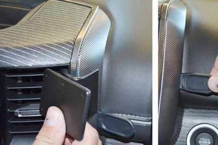 Use the enclosed alcohol pad to clean the area where the ProClip is to be installed. Press the thin end of the enclosed gap opener into the gap between the center console and the dasboard, to widen the gap. Peel off the adhesive tape cover on the ProClip. Place the left edge of the ProClip, with adhesive tape, onto the right side of the frame surrounding the air vent.