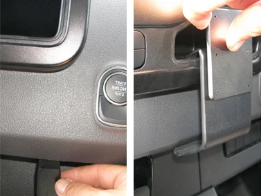 Press the thin end of the enclosed gap opener into the gap between the dashboard surrounding the control panel and the lower section of the dashboard, to widen the gap. Hook/Place the upper part of the ProClip into the coin compartment.