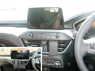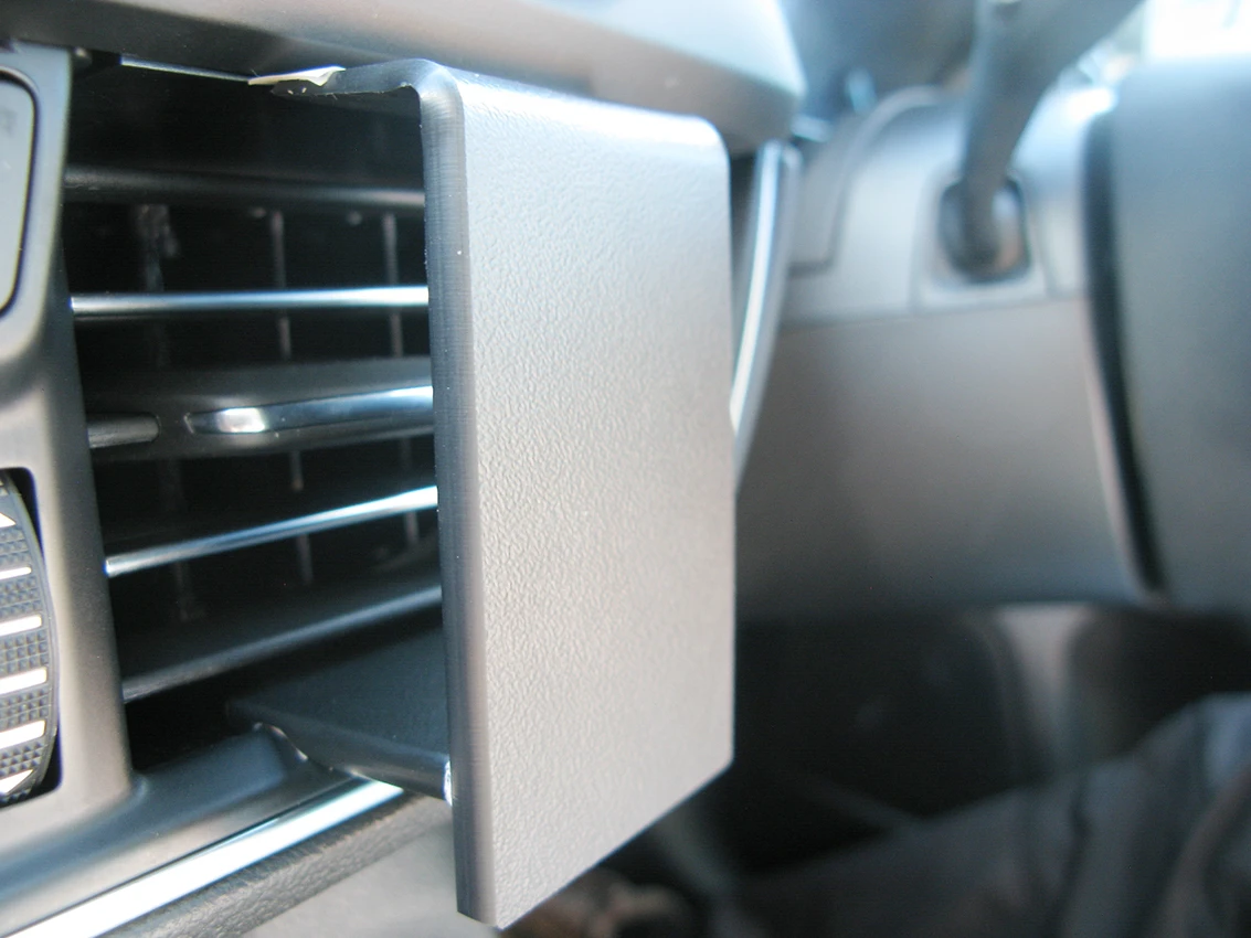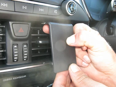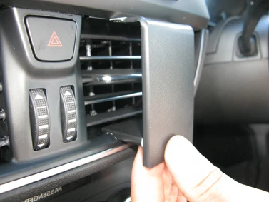 Use the enclosed alcohol pad to clean the area where the ProClip is to be installed. Pee off the adhesive tape covers on the ProClip. Press the angled edge on the upper part of the ProClip upwards into the gap between the air vent and the surrounding frame.
