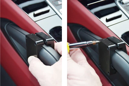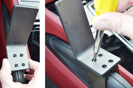 Use the enclosed alcohol pad to clean the area where the ProClip is to be installed. Peel off the adhesive tape cover on the ProClip. Align the two base parts of the ProClip onto the console side handle. Attach the two parts together with the enclosed screws.