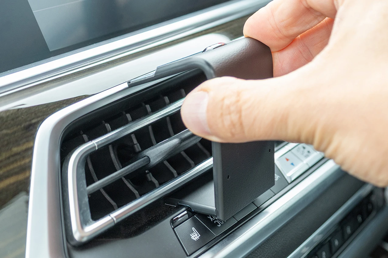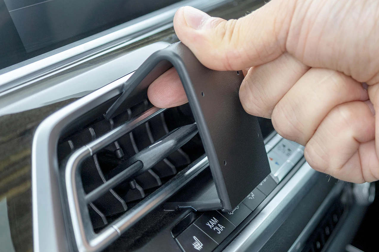 Press down and all the way forward on the top of the mount, so the upper edge hooks/clips under the frame surrounding the air vent.