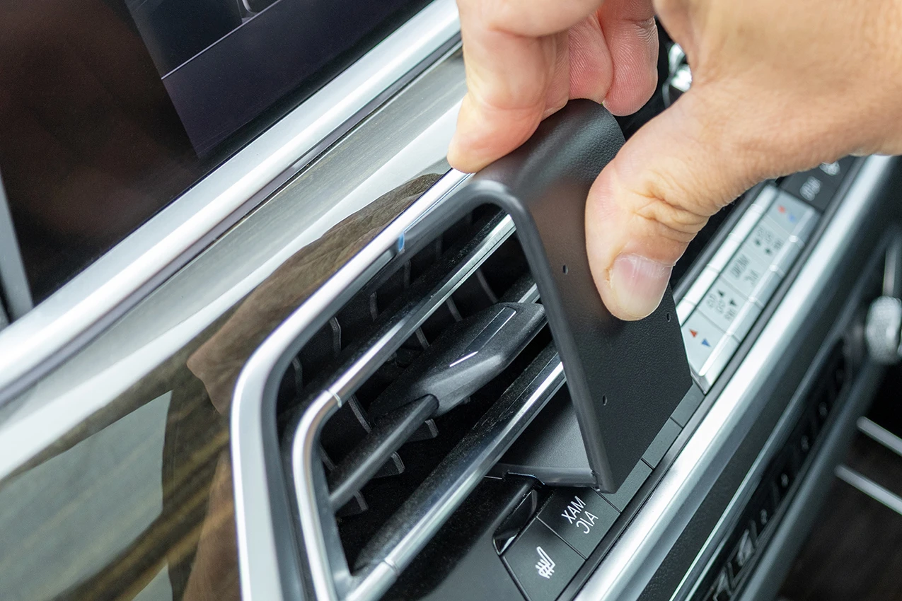 Use the enclosed alcohol pad to clean the area where the mount will be installed. Peel off the adhesive tape cover. Place the bottom edge of the mount on the frame surrounding the air vent.