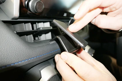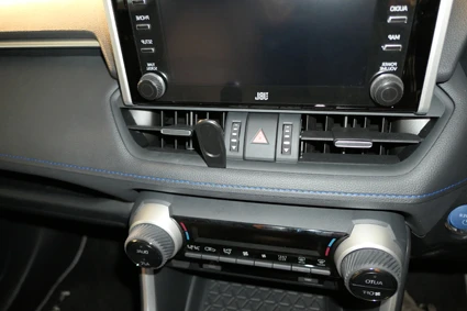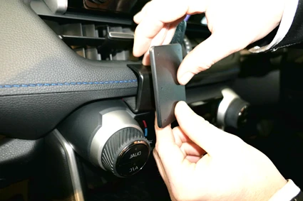 Press the ProClip downward and forward so the upper edge hooks under the frame surrounding the air vent. Press the lower part of the ProClip, with adhesive tape, into the gap between the dashboard and the control panel. Pull out the gap opener.
