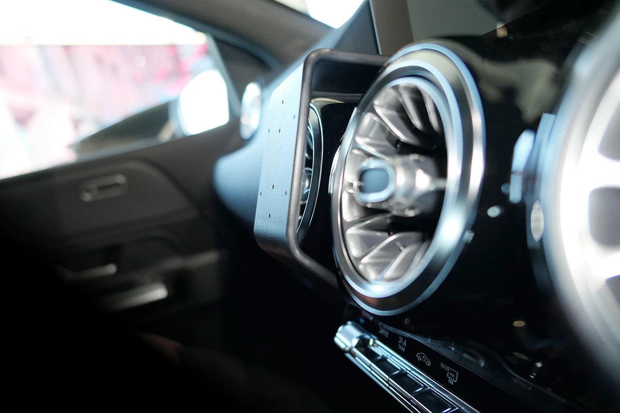 Press/Flip the ProClip upward/forward so the lower edge hooks behind the frame surrounding the control panel. Pull the upper part of the ProClip upward and hook the angled upper edge over the frame surrounding the air vent. Press downward on top of the ProClip so the angled edge hooks properly in place and the adhesive tape attaches.