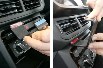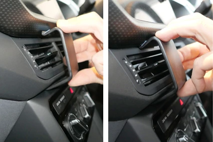 Press the upper part of the ProClip downward/forward and hook the angled upper edge into the gap between the frame surrounding the air vent and the dashboard.