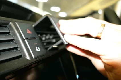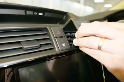 Use the enclosed alcohol pad to clean the area where the ProClip is to be installed. Peel off the cover of adhesive tape on the ProClip. Hook the grooved edge on the upper part of the PoClip under the inner edge of the frame surrounding the air vent.