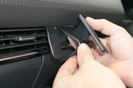 Use the enclosed alcohol pad to clean the area where the ProClip is to be installed. Press the thin edge of the enclosed gap opener into the gap between the frame surrounding the air vent and the dashboard, to widen the gap. Peel off the cover of adhesive tape on the ProClip. Press the angled edge on the upper part of the ProClip into the gap next to the gap opener. Pull out the gap opener.